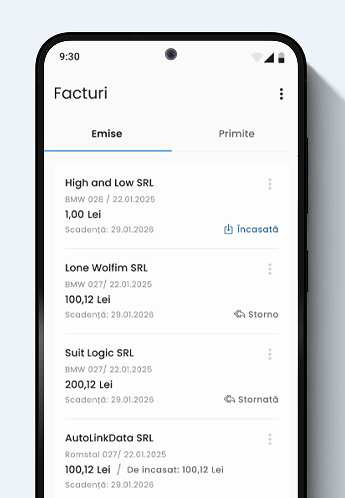 acum emiți și primești facturi direct în aplicație, iar ele se încarcă automat în e-factura, de oriunde ai fi